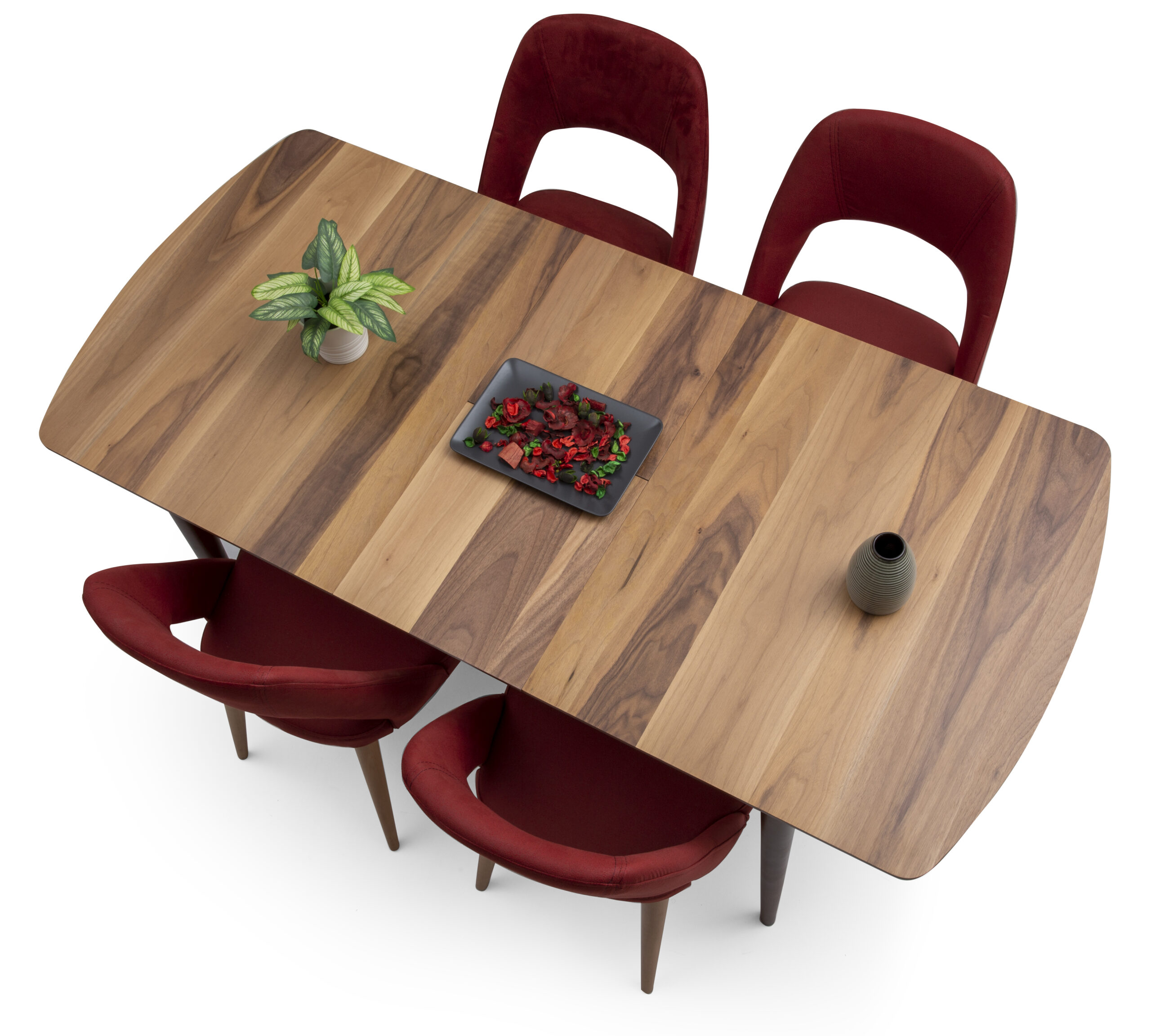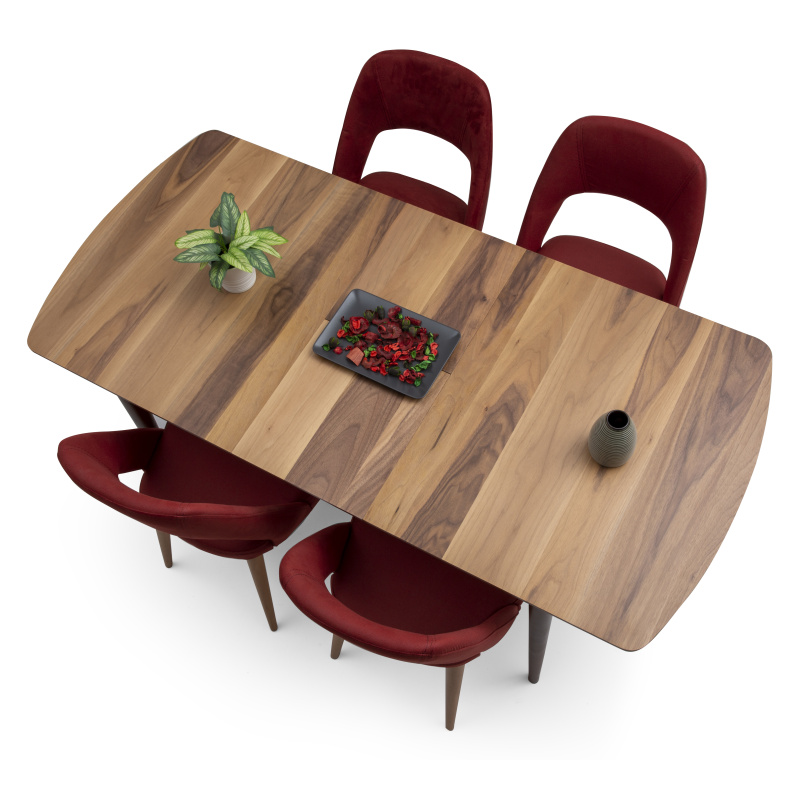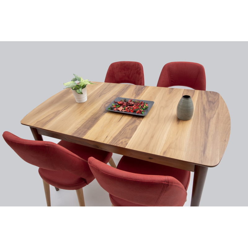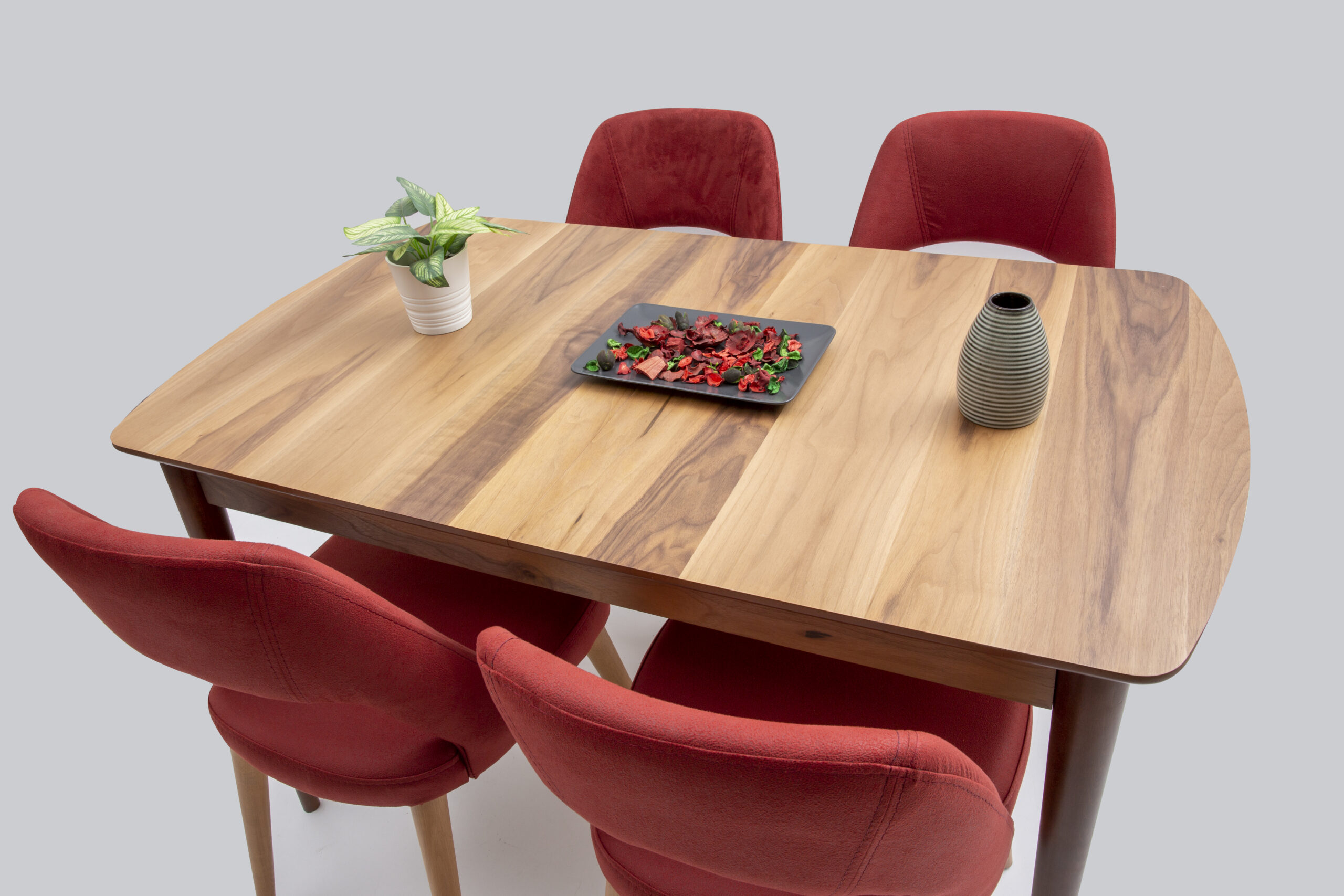 Dieser Esstisch im modernen, eleganten Design wird von vier stilvollen, roten Stühlen begleitet, die dank ihrer gepolsterten Sitze für maximalen Komfort sorgen. Der Tisch aus Holz sorgt für eine warme und einladende Atmosphäre in jedem Essbereich. Bitte beachten Sie, dass die abgebildeten Stühle im Preis nicht inbegriffen sind.