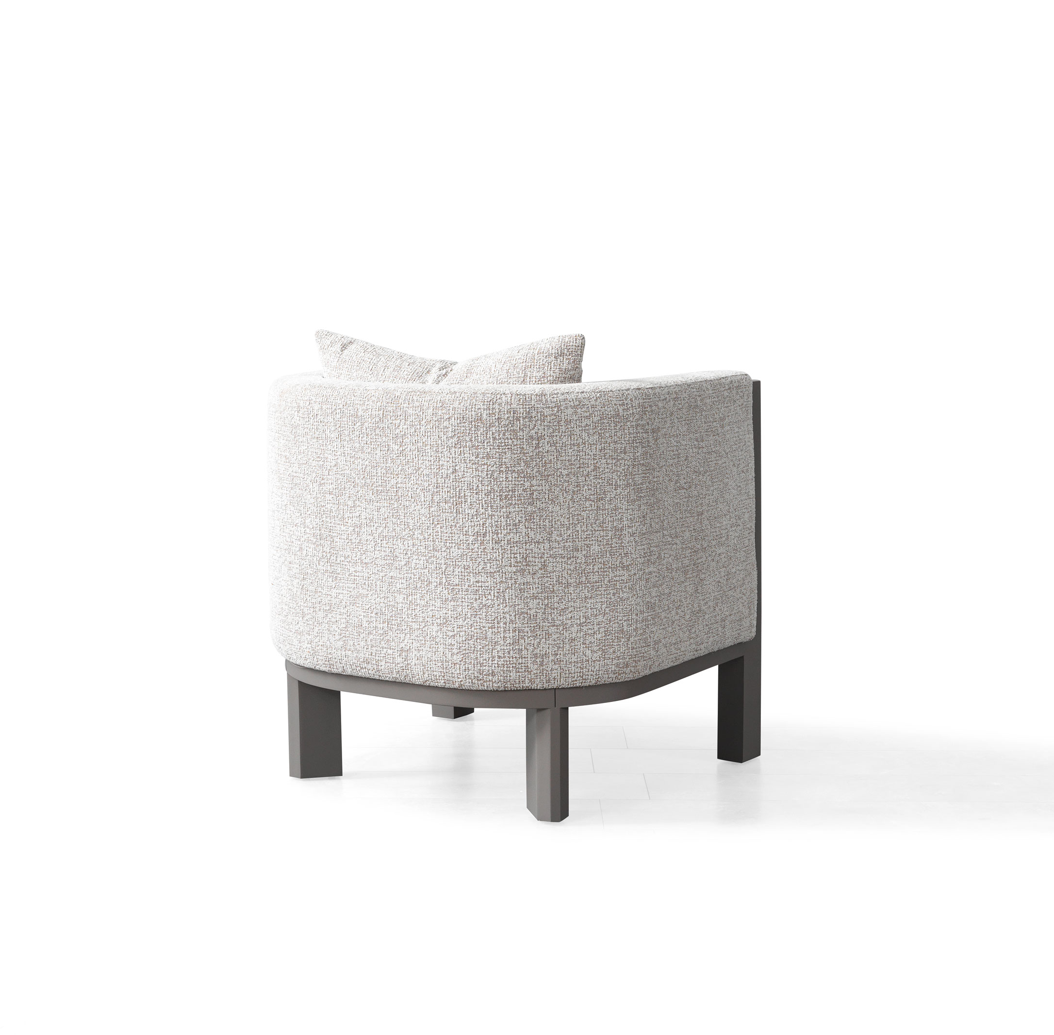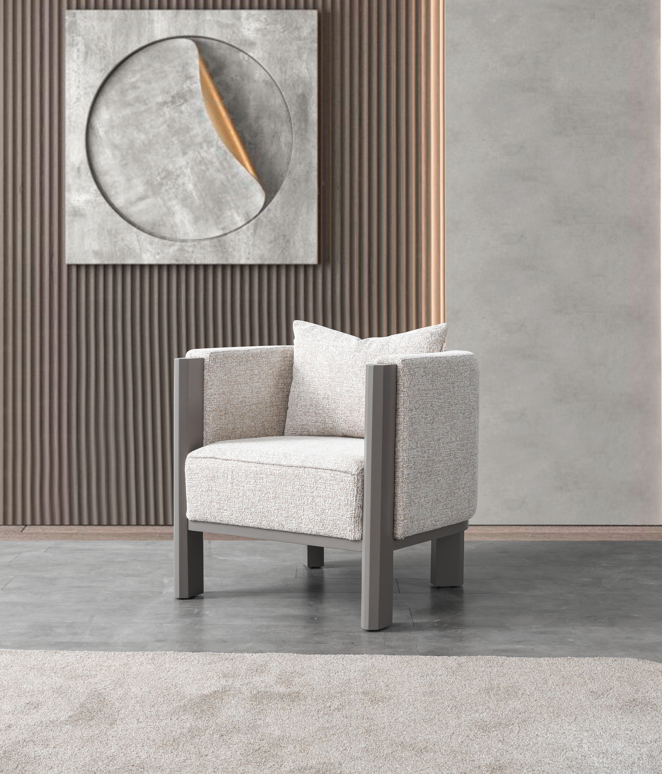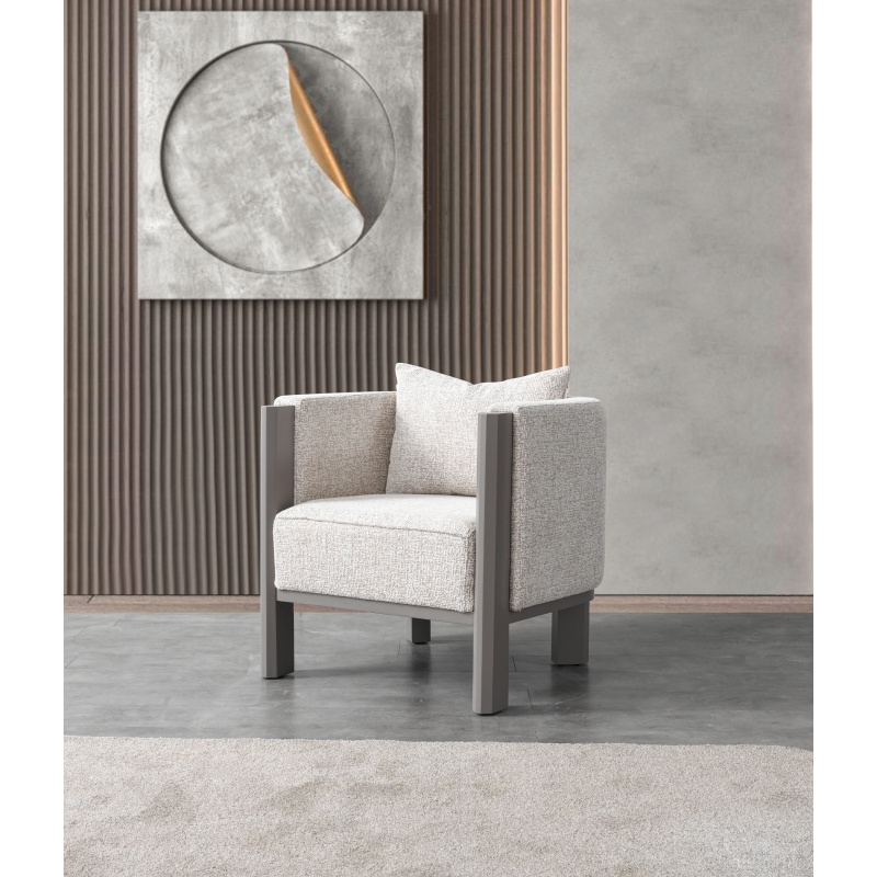 Dieses elegante Bergère besticht durch modernes Design und hohen Komfort. Die klaren Linien und der robuste Rahmen aus Metall in Kombination mit dem weichen, grauen Bezug schaffen eine harmonische Balance zwischen zeitgenössischer Ästhetik und Bequemlichkeit. Der Stuhl bietet optimalen Sitzkomfort und ist ein perfektes Highlight für jeden Raum. Ideal für moderne Wohnzimmer, wo Funktionalität und Stil gefragt sind.