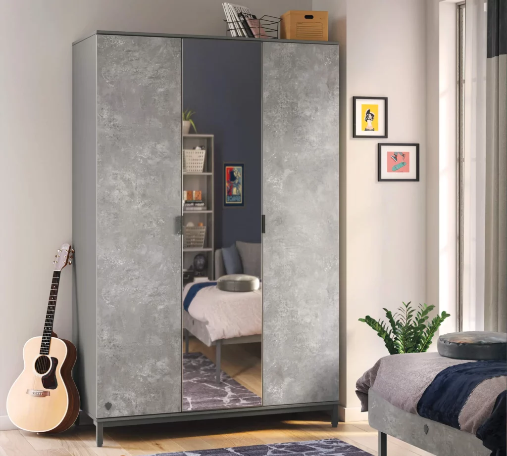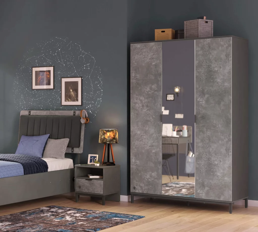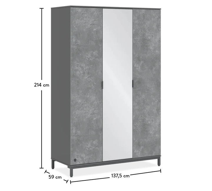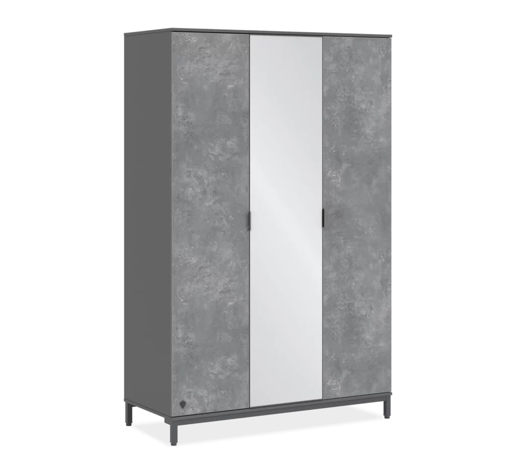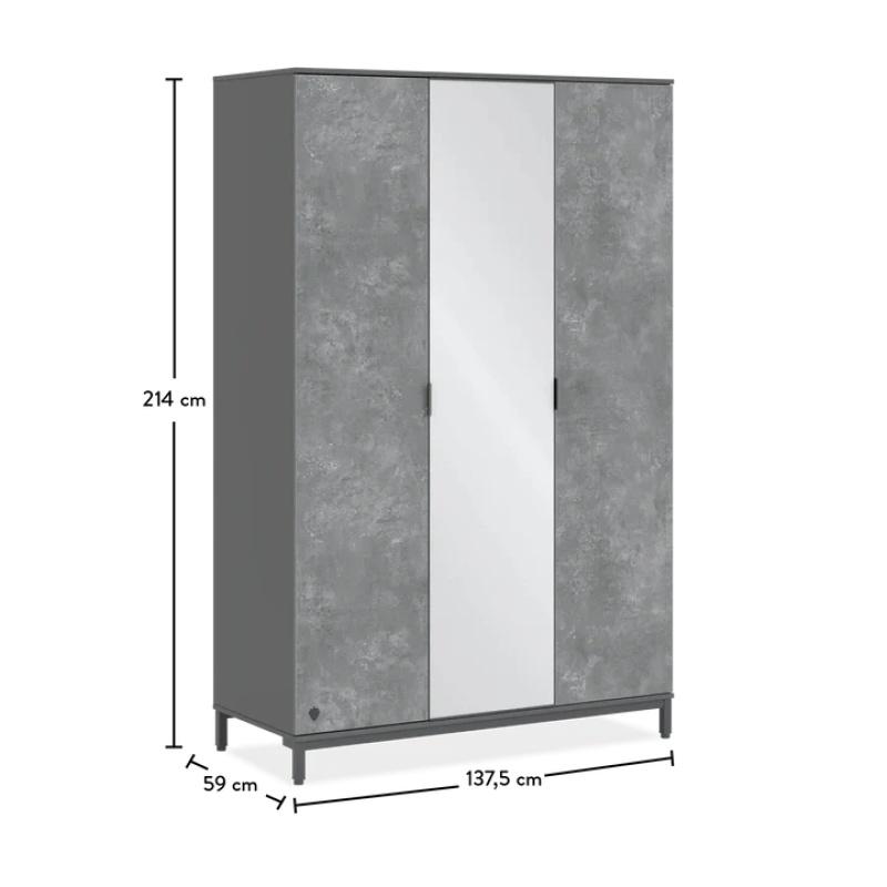Der dreitürige Schrank in Space Grey bietet mit seinen vielen Regalen praktische Lösungen für Ihre Aufbewahrungsbedürfnisse. Wenn Sie Ihre Kleidung aufhängen möchten, möchten wir Sie daran erinnern, dass es einen großen Stauraum zum Aufhängen gibt. Mit seinen 2 Schubladen und der speziellen Unterteilung in der oberen Schublade, der verstellbaren Regalhöhe an der rechten Tür, dem Ganzkörperspiegel an der mittleren Tür, dem selbstbremsenden Scharnier, den Lüftungskapseln und seinem natürlichen und einzigartigen Design bietet Space Grey eine komplette Welt mit funktionalen Details.