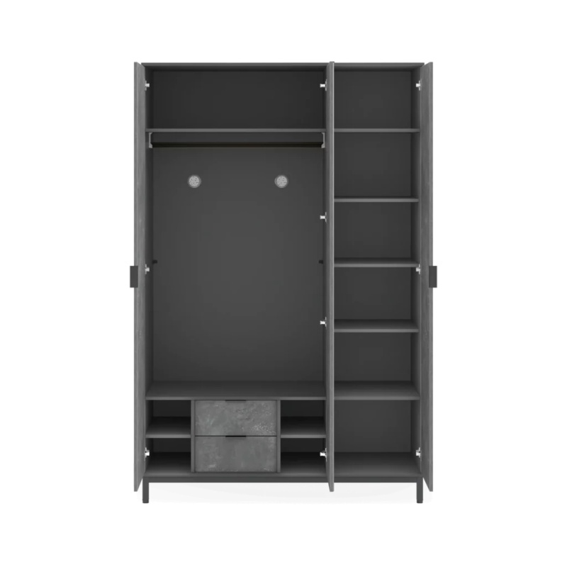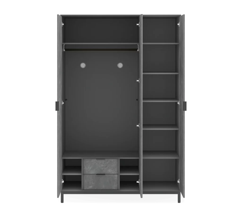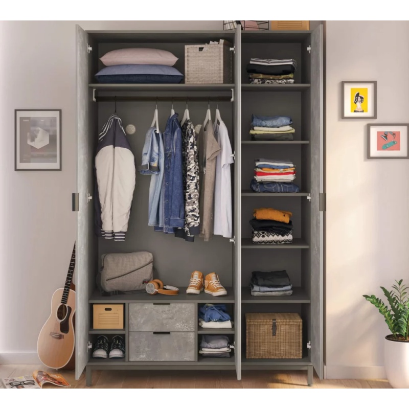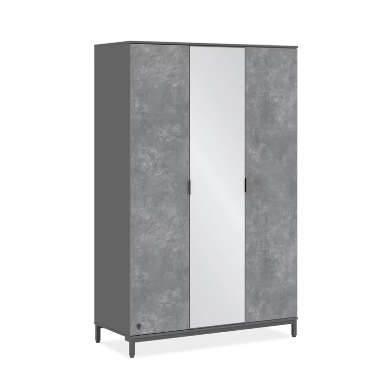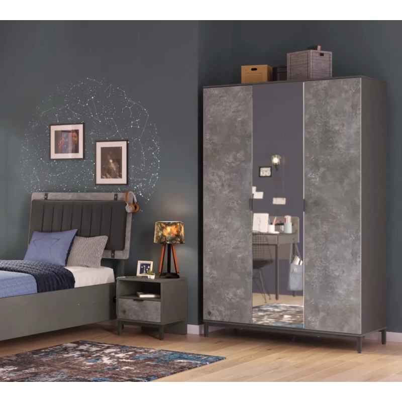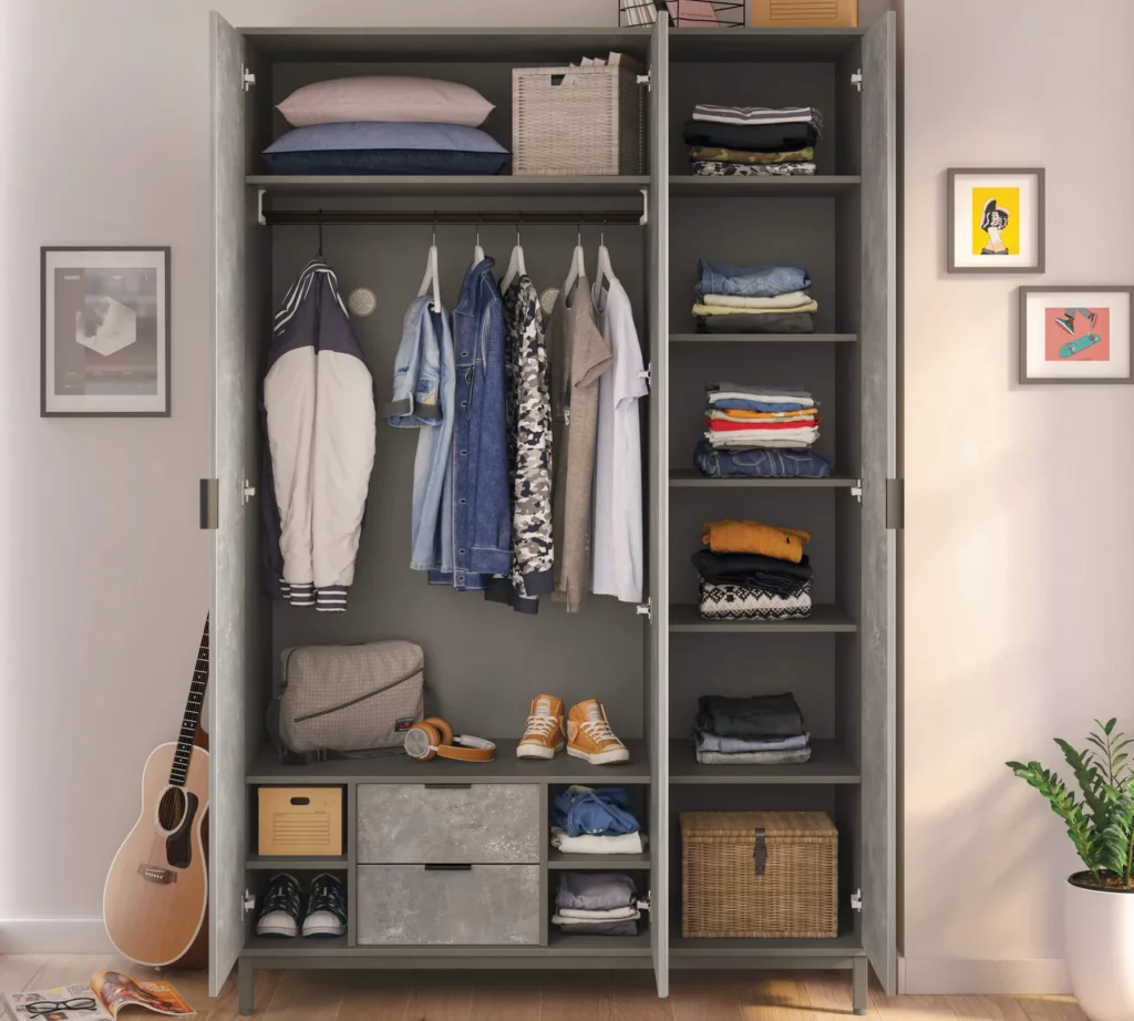 Der dreitürige Schrank in Space Grey bietet mit seinen vielen Regalen praktische Lösungen für Ihre Aufbewahrungsbedürfnisse. Wenn Sie Ihre Kleidung aufhängen möchten, möchten wir Sie daran erinnern, dass es einen großen Stauraum zum Aufhängen gibt. Mit seinen 2 Schubladen und der speziellen Unterteilung in der oberen Schublade, der verstellbaren Regalhöhe an der rechten Tür, dem Ganzkörperspiegel an der mittleren Tür, dem selbstbremsenden Scharnier, den Lüftungskapseln und seinem natürlichen und einzigartigen Design bietet Space Grey eine komplette Welt mit funktionalen Details.