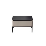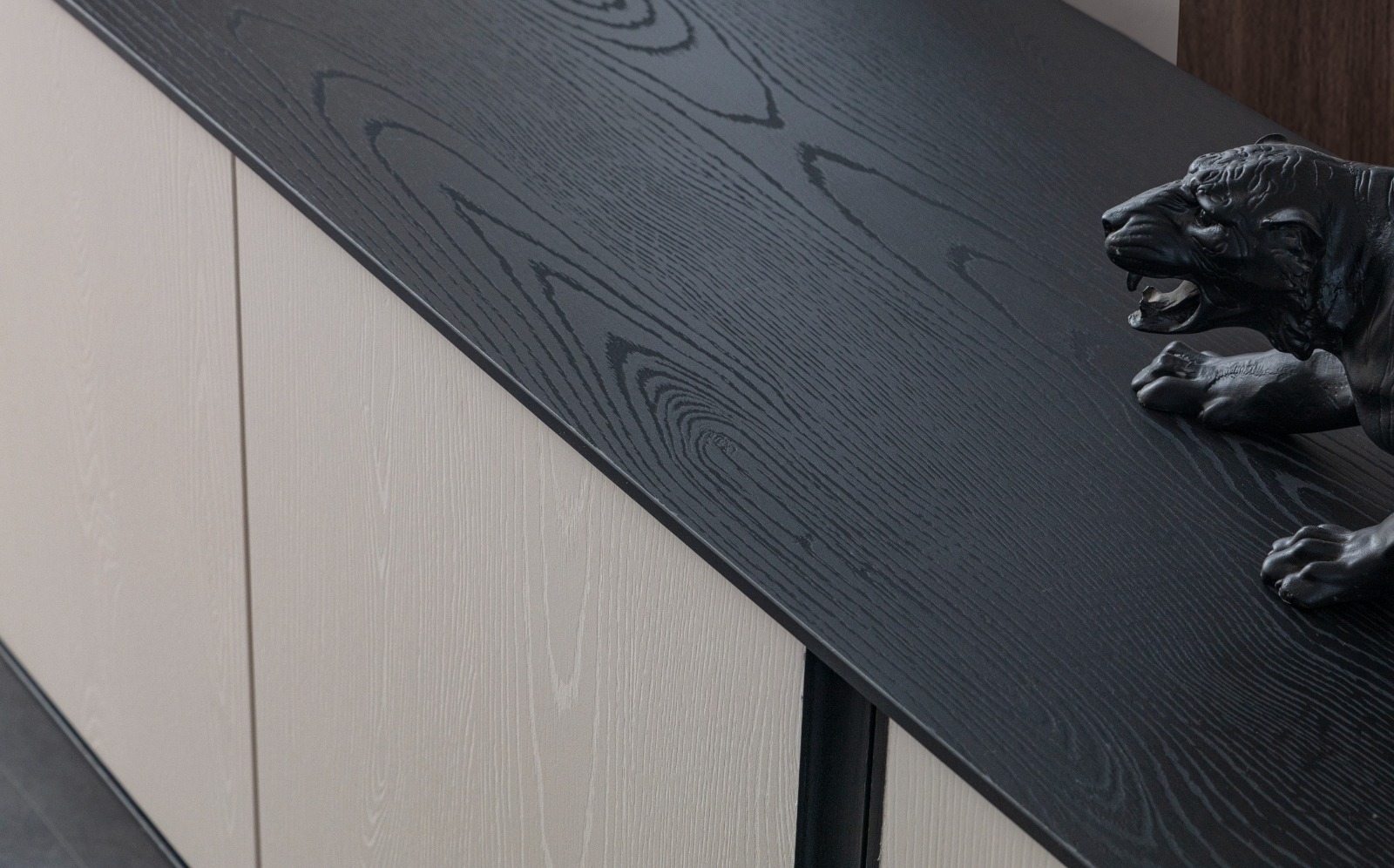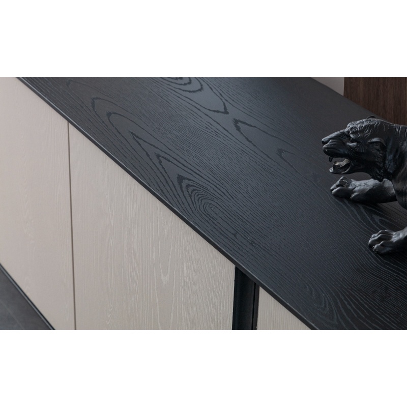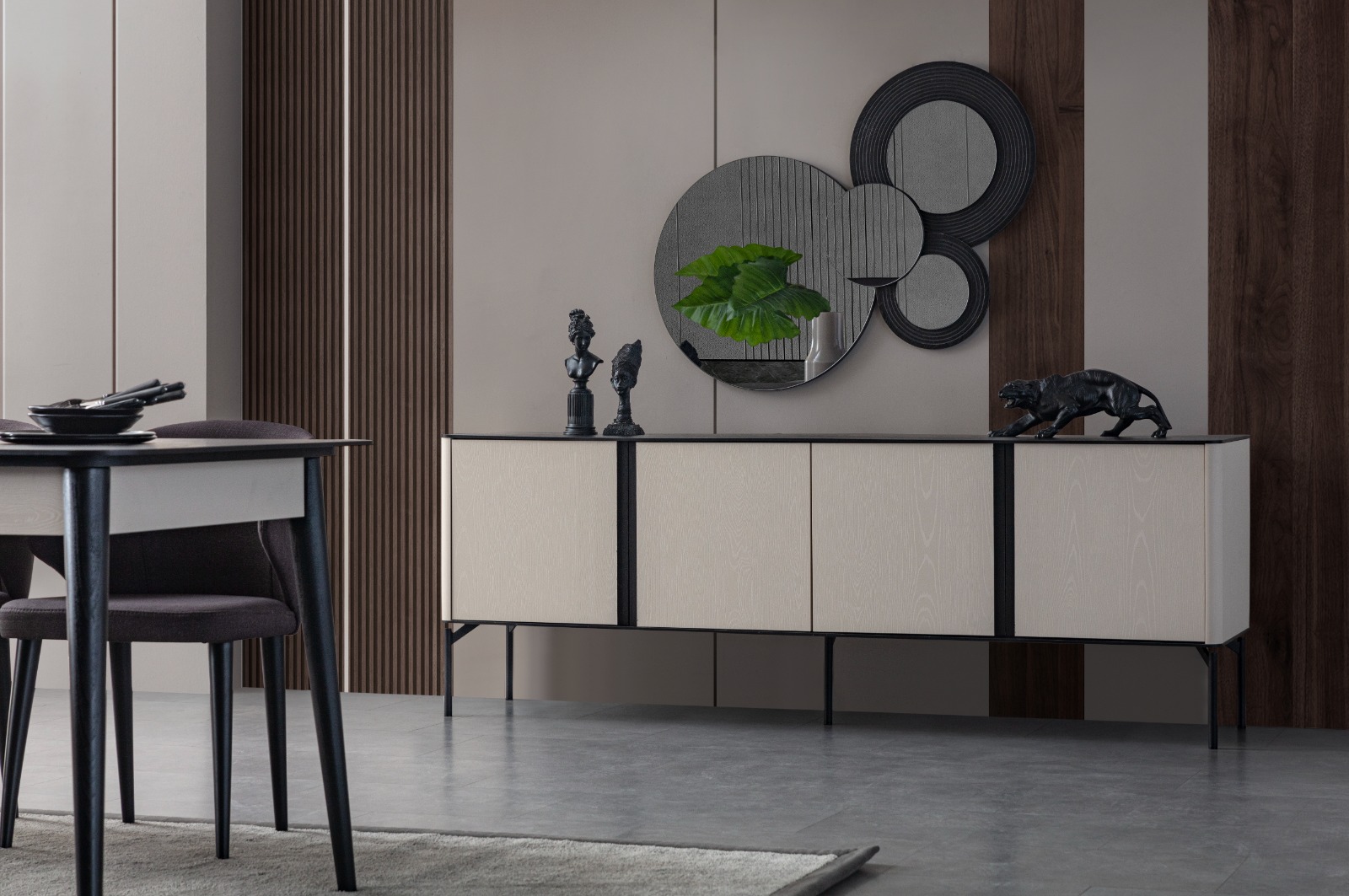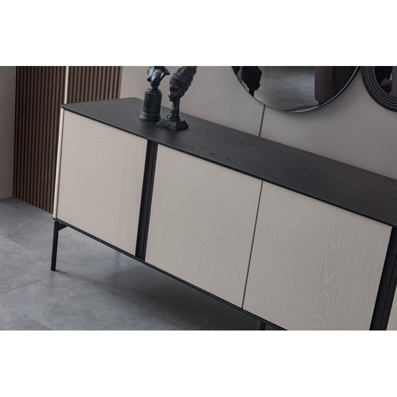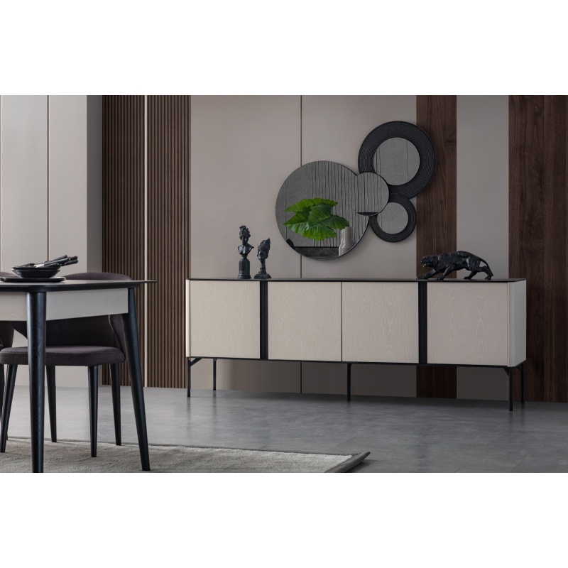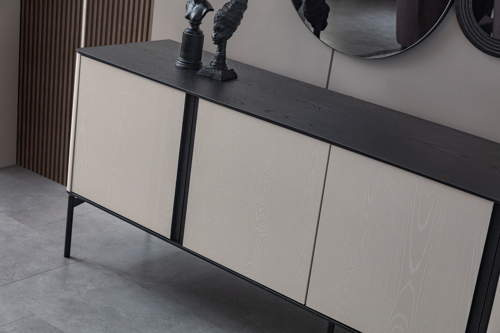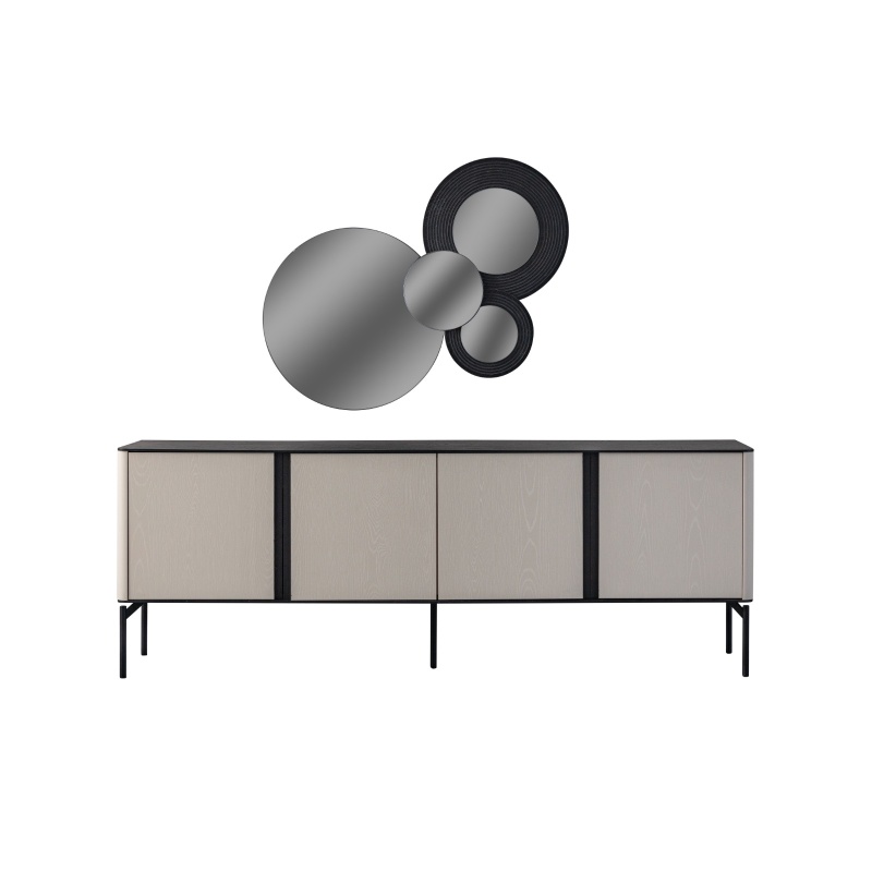 Diese moderne Anrichte besticht durch ein elegantes und minimalistisches Design. Die klare, strukturierte Oberfläche aus hellem Holz und die schwarzen Akzente sorgen für eine stilvolle und zeitlose Optik. Die schlichten Metallbeine verleihen dem Möbelstück eine leichte Erscheinung, während die geräumigen Fächer hinter den Türen praktischen Stauraum bieten. Der dazu passende, kreative Spiegel mit mehreren ineinander verschlungenen Ringen ergänzt das Möbelstück und bringt eine künstlerische Note in den Raum. Diese Anrichte ist eine perfekte Ergänzung für moderne Wohnzimmer oder Flure, die auf funktionales Design und ästhetische Schönheit setzen.