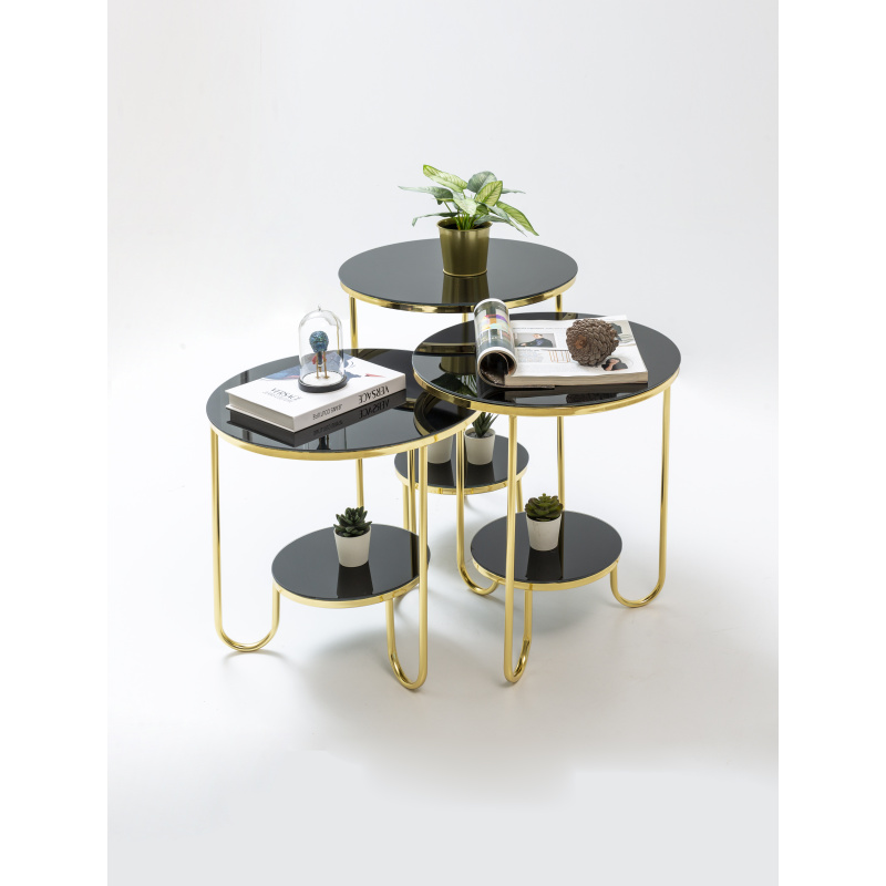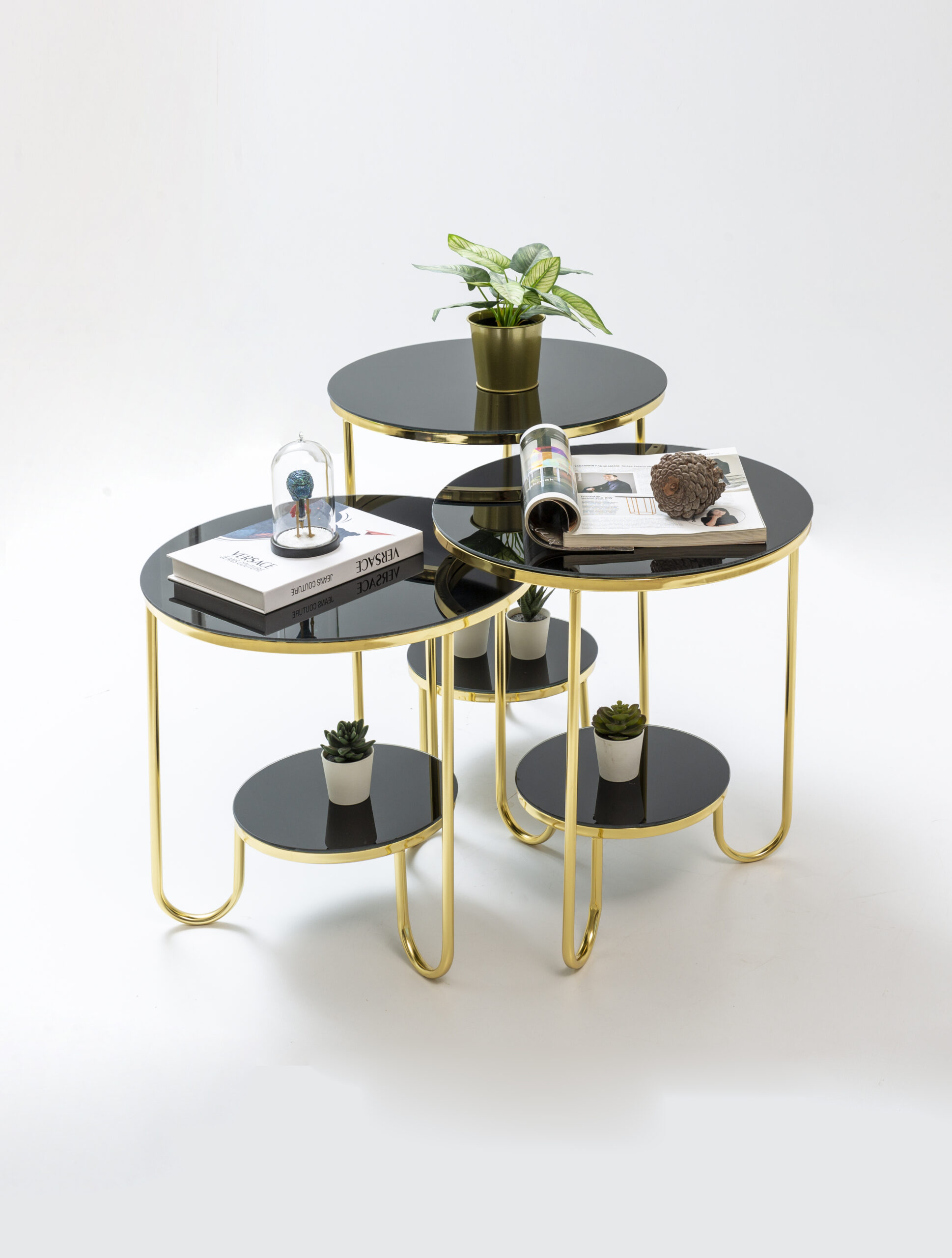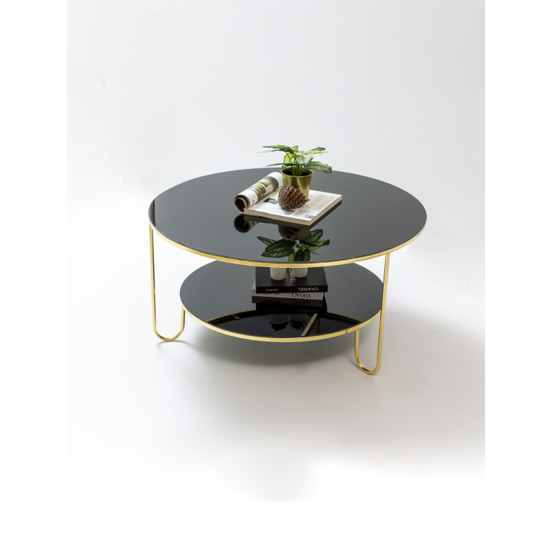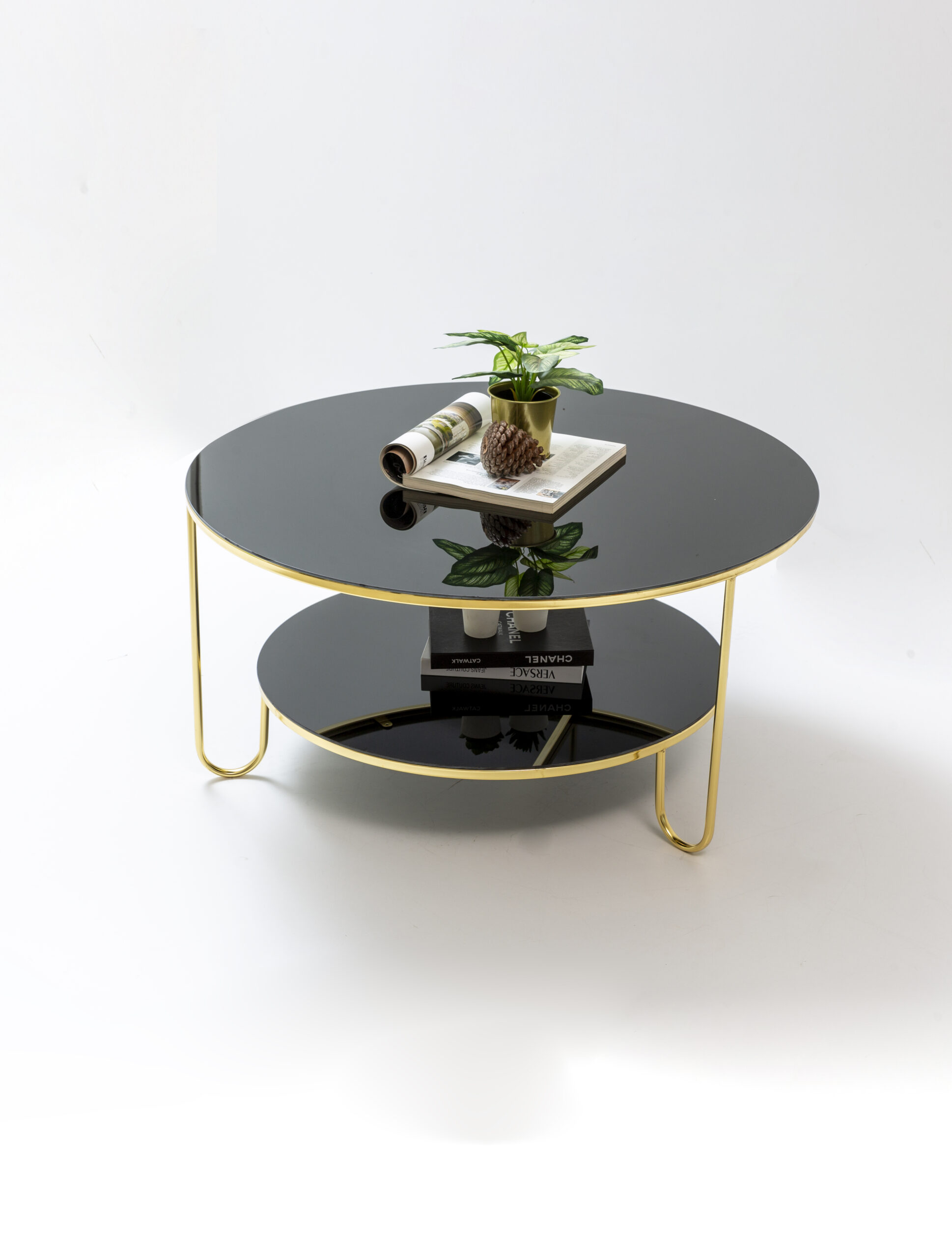 Dieser Tisch hat ein elegantes, modernes Design mit einer schwarzen, glänzenden Tischoberfläche und einem goldenen Metallgestell, das sowohl oben als auch unten eine zusätzliche Ablagefläche bietet. Die Kombination aus Gold und Schwarz verleiht ihm eine edle Ausstrahlung. Der Tisch bietet ausreichend Platz für Dekoartikel und Bücher, was ihn sowohl funktional als auch ästhetisch ansprechend macht.