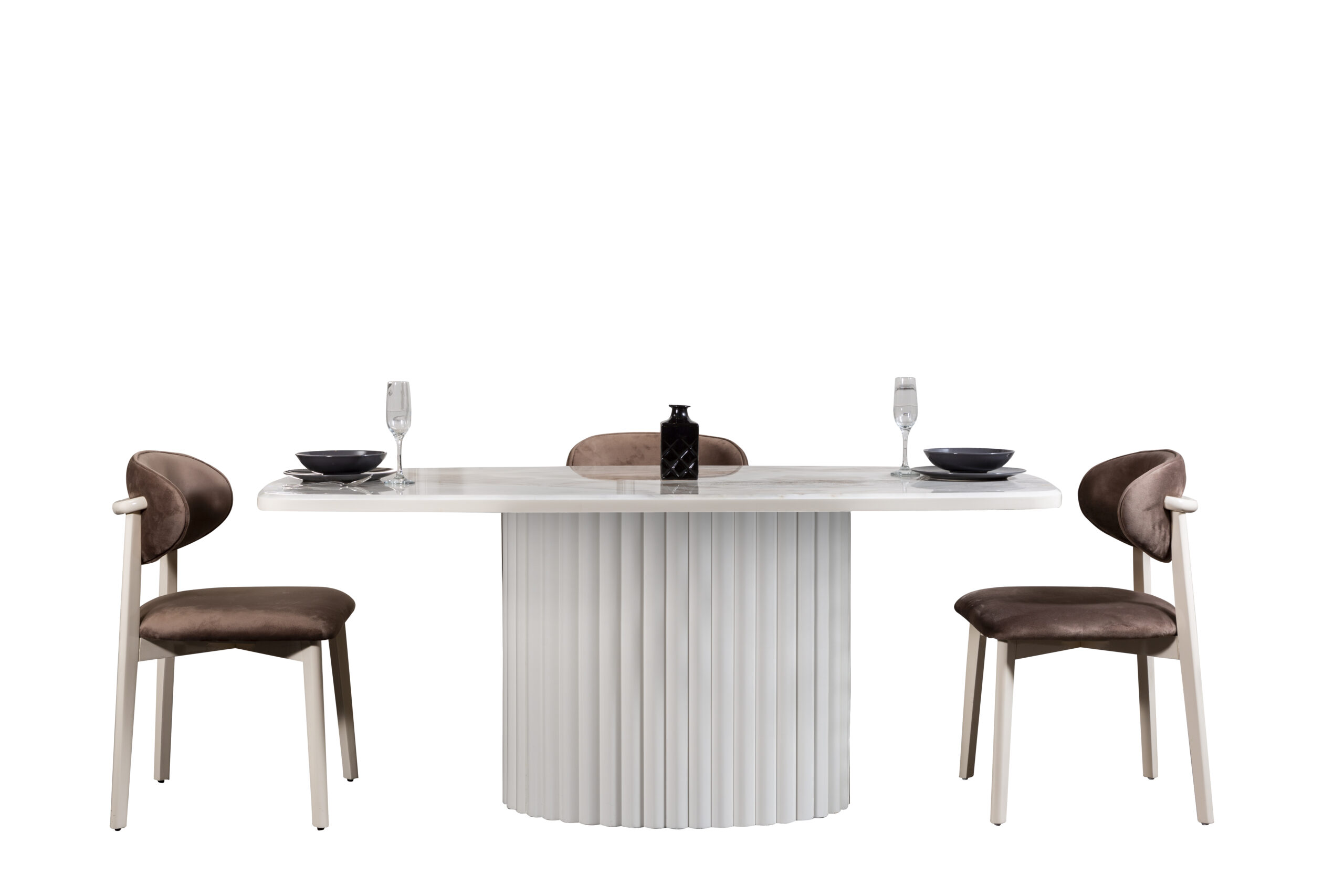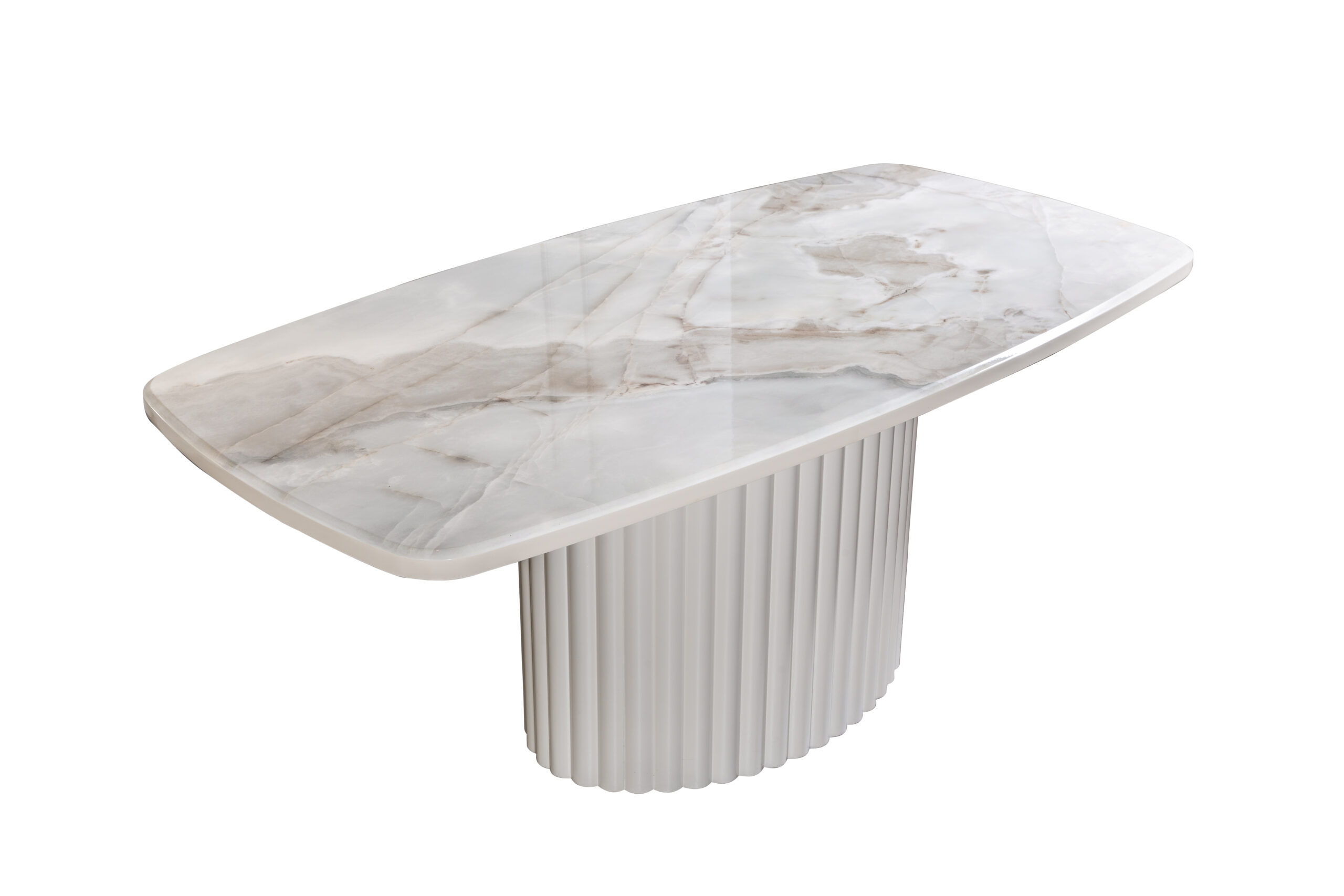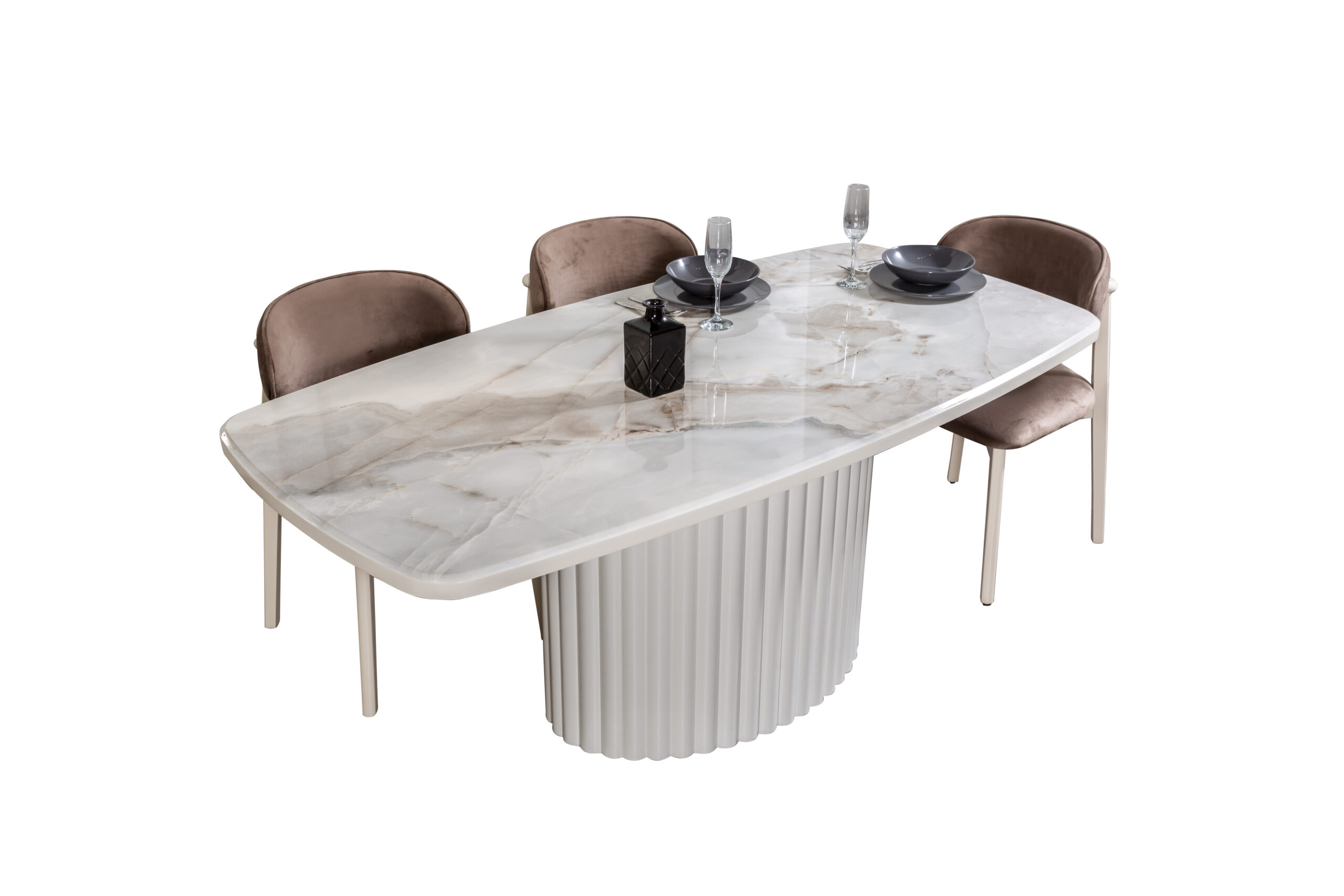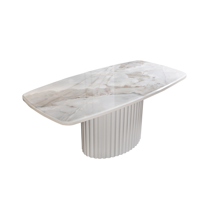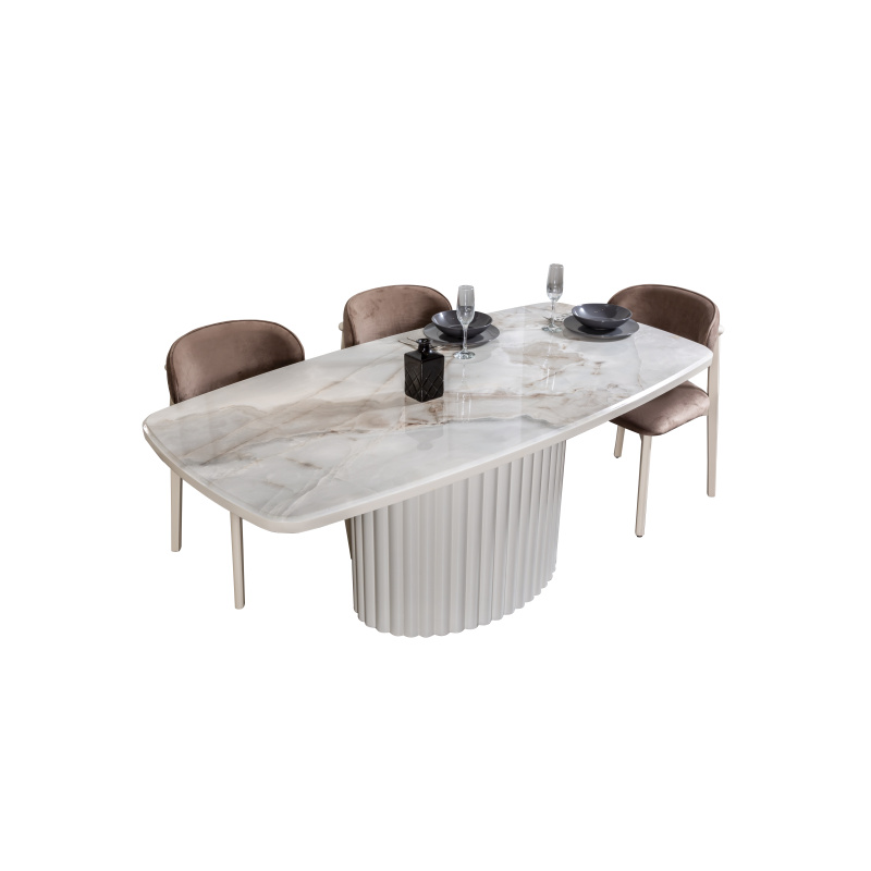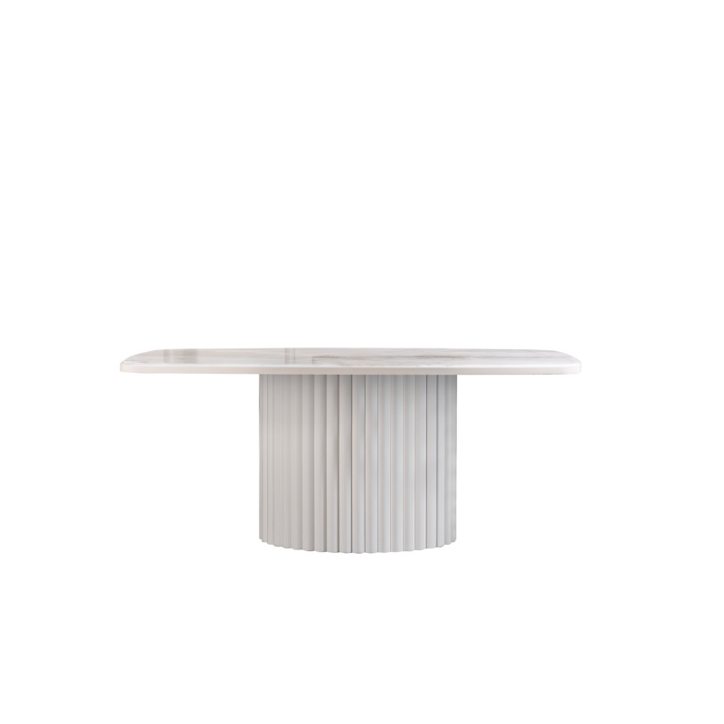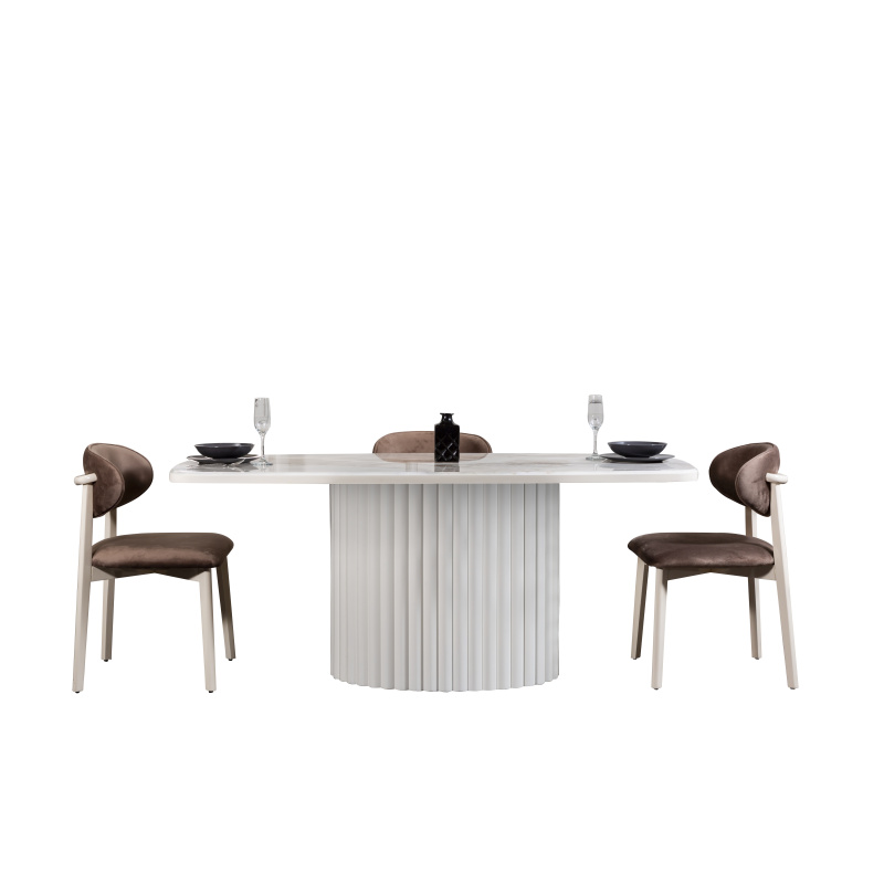 Dieser elegante Esstisch vereint modernes Design mit zeitloser Eleganz. Die Tischplatte aus hochwertigem Marmor wird von einer stilvollen, gerippten Basis aus hochwertigem Material unterstützt, die dem Tisch eine edle und dennoch kraftvolle Ausstrahlung verleiht. Der Tisch ist in verschiedenen Farbtönen erhältlich, um sich ideal in jedes moderne Zuhause einzufügen. Beachte bitte, dass die Stühle nicht im Lieferumfang enthalten sind.