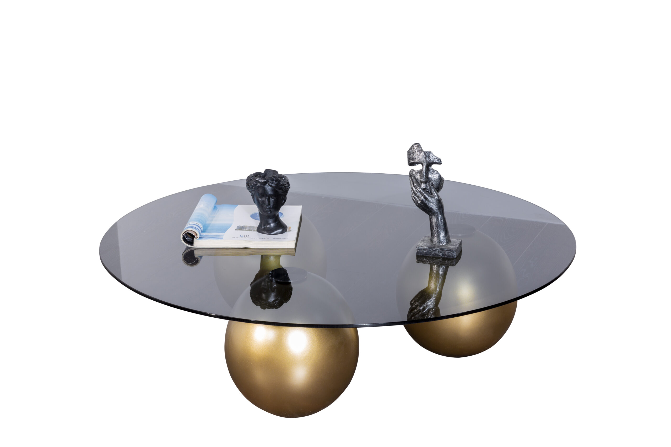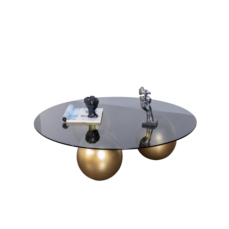 Dieser exklusive Couchtisch kombiniert eine runde Glasplatte mit auffälligen, goldenen Kugelfüßen, die für ein luxuriöses und modernes Design sorgen. Die klare Glasoberfläche verleiht dem Tisch eine elegante Leichtigkeit, während die goldenen Elemente einen stilvollen Akzent setzen. Perfekt als Highlight in Ihrem Wohnzimmer und ideal für eine moderne Inneneinrichtung.