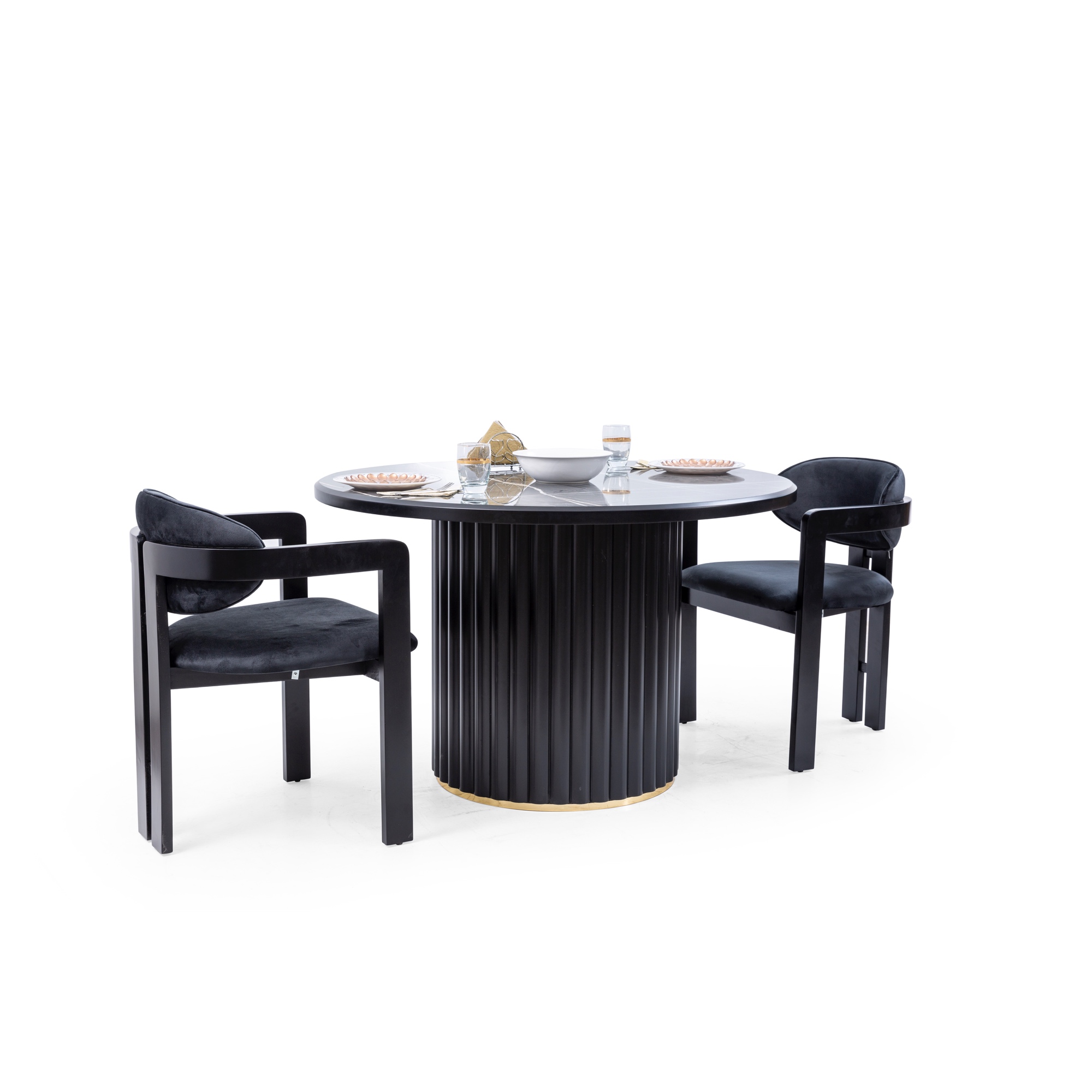 Dieser elegante runde Tisch mit einer schwarzen Marmoroberfläche und goldenen Akzenten wird von stilvollen schwarzen Stühlen mit gepolsterten Sitzen begleitet. Bitte beachten Sie, dass in diesem Angebot nur der Tisch enthalten ist.