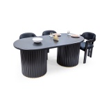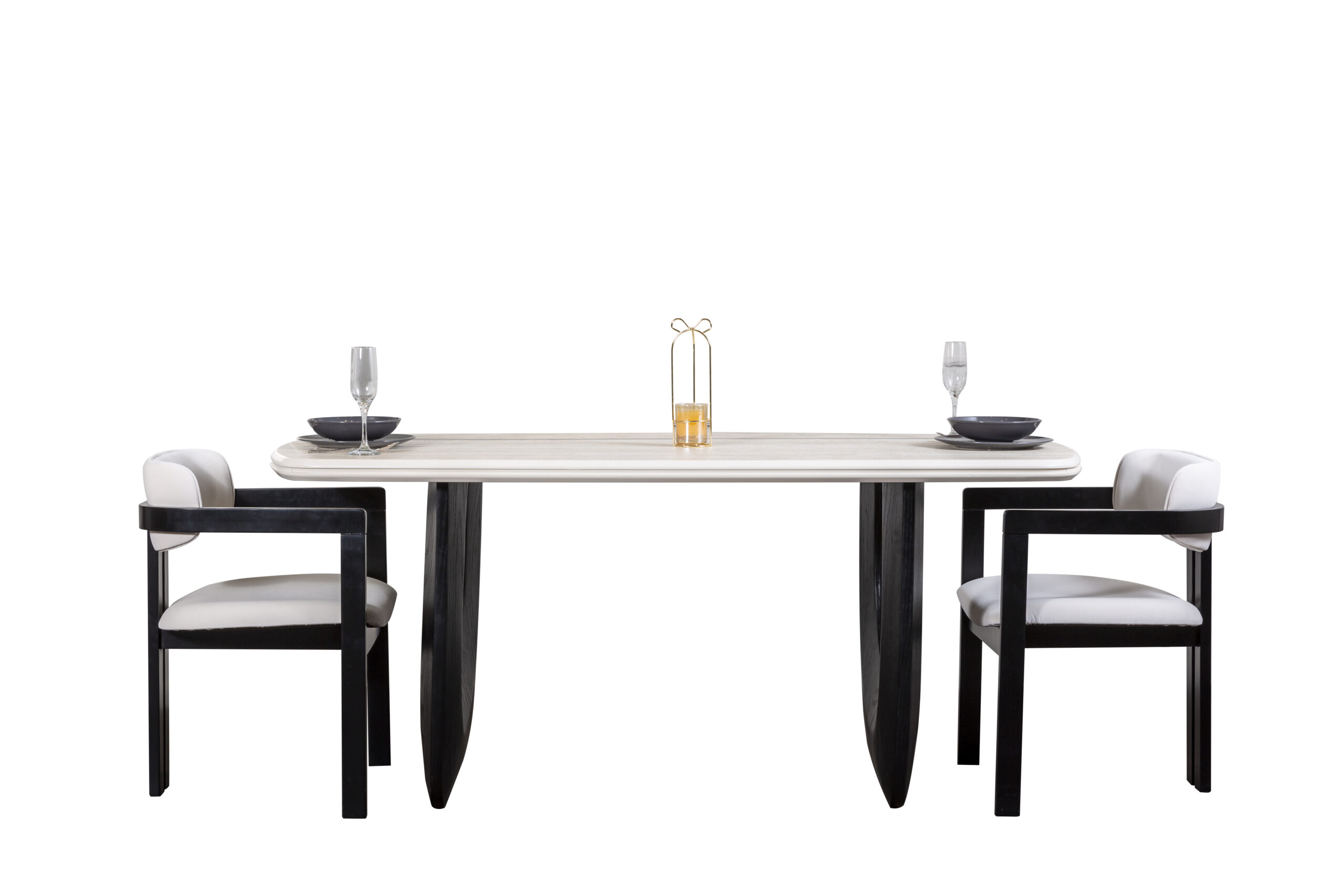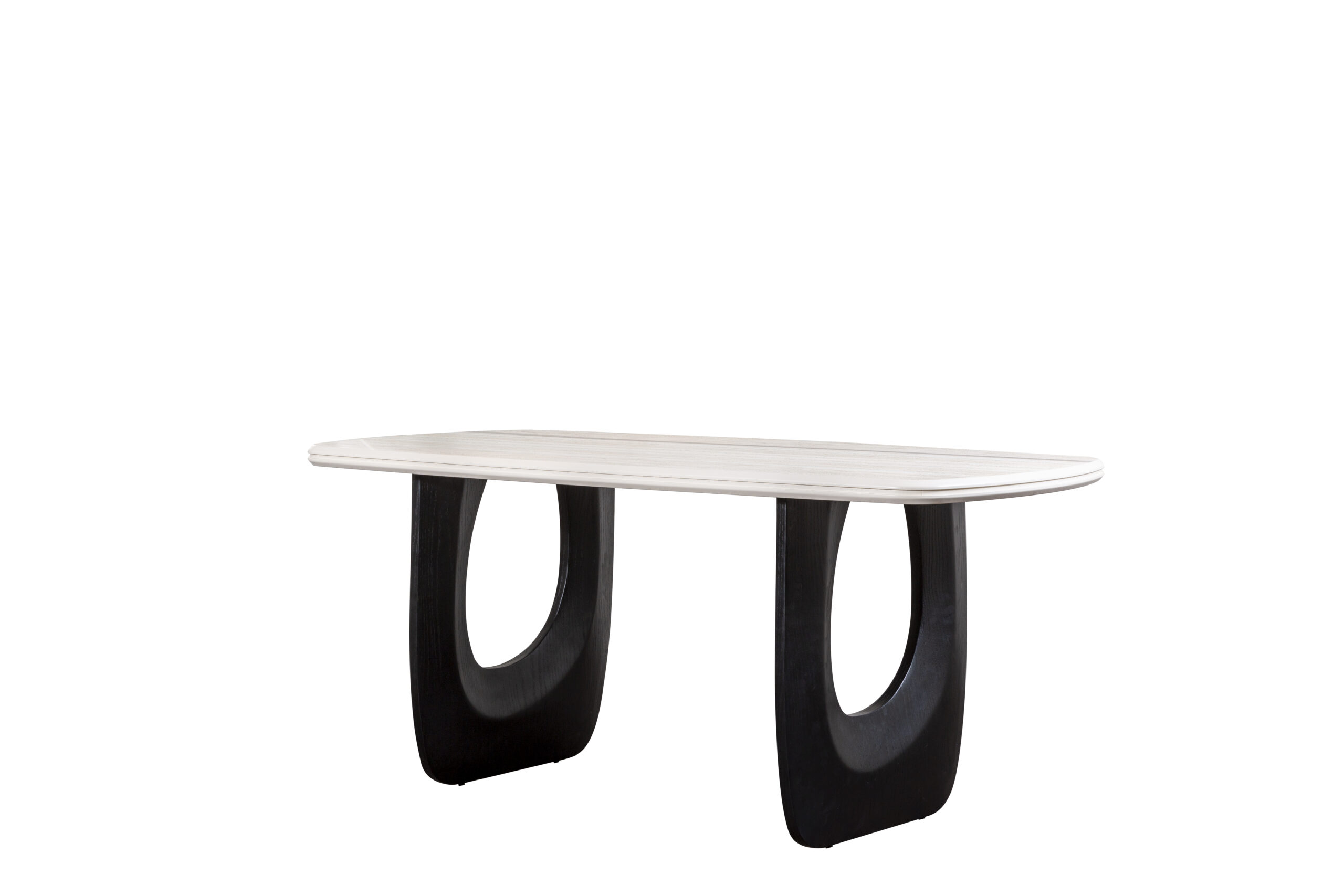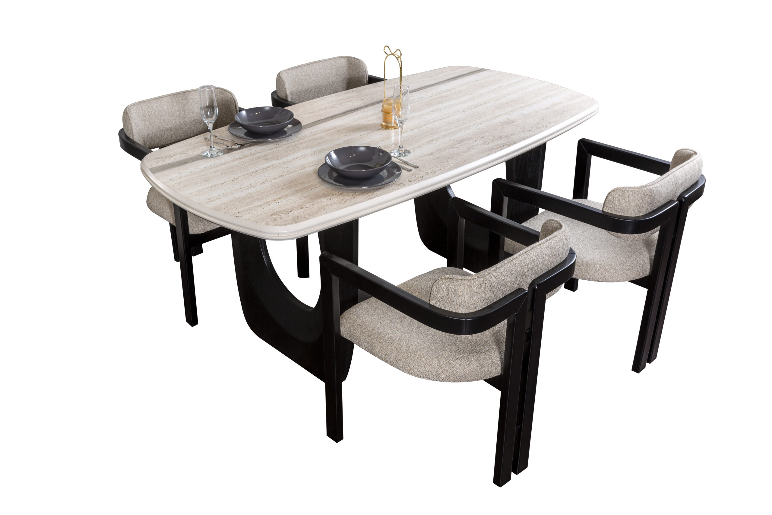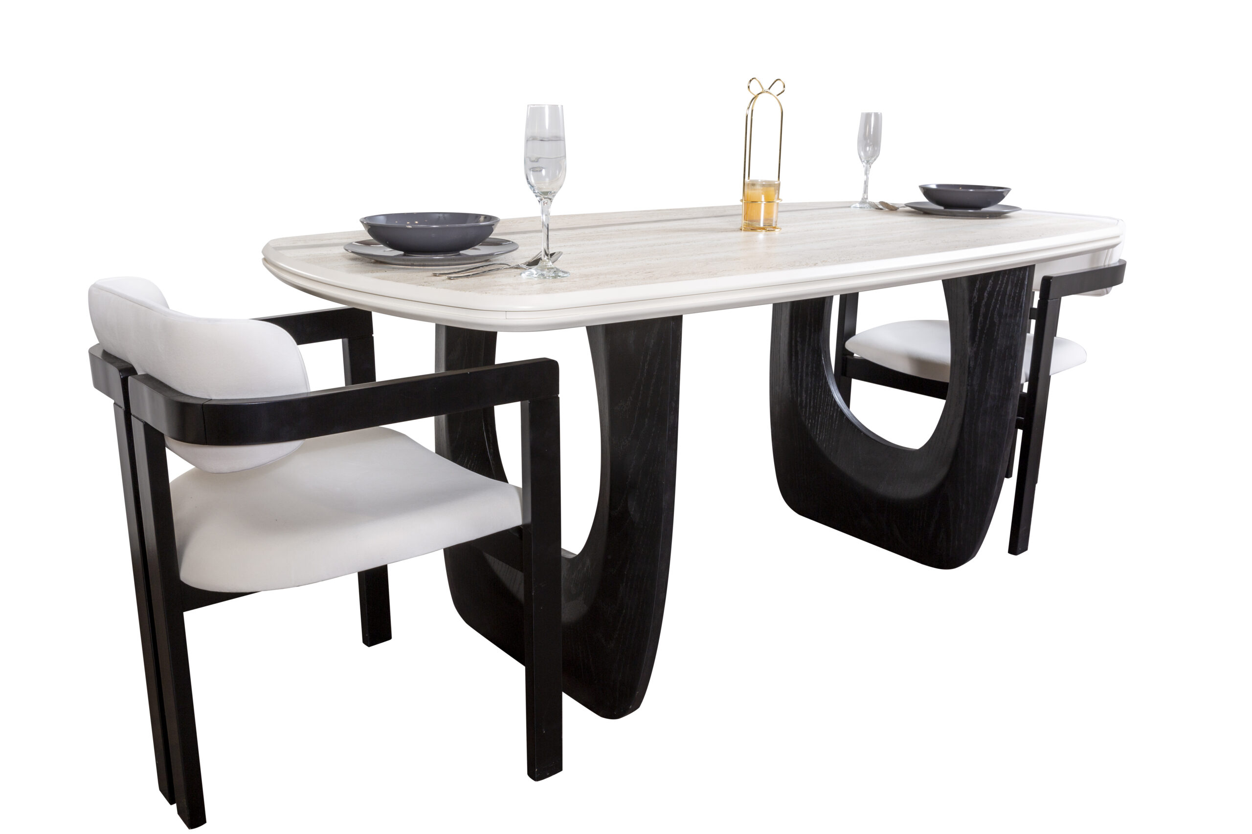 Dieser elegante Esstisch ist nicht nur ein funktionales Möbelstück, sondern auch ein wahres Design-Highlight für jedes moderne Zuhause. Die Tischplatte mit einer auffälligen, feinen Struktur und die markante Basis schaffen eine harmonische Balance zwischen klassischem und zeitgenössischem Stil. Die schwarzen Akzente an den Beinen sowie die bequemen, stilvollen Stühle aus hochwertigem Material runden das Set ab. Der Tisch ist in verschiedenen Farben erhältlich, wodurch er sich perfekt an dein individuelles Raumkonzept anpasst. Beachte, dass die Stühle nicht im Lieferumfang enthalten sind.