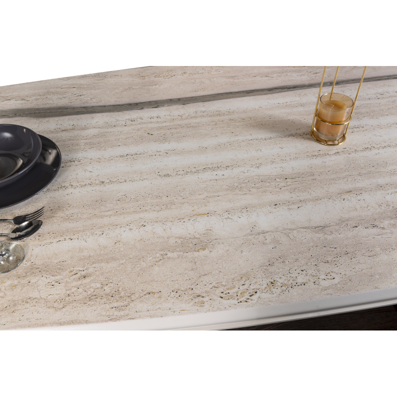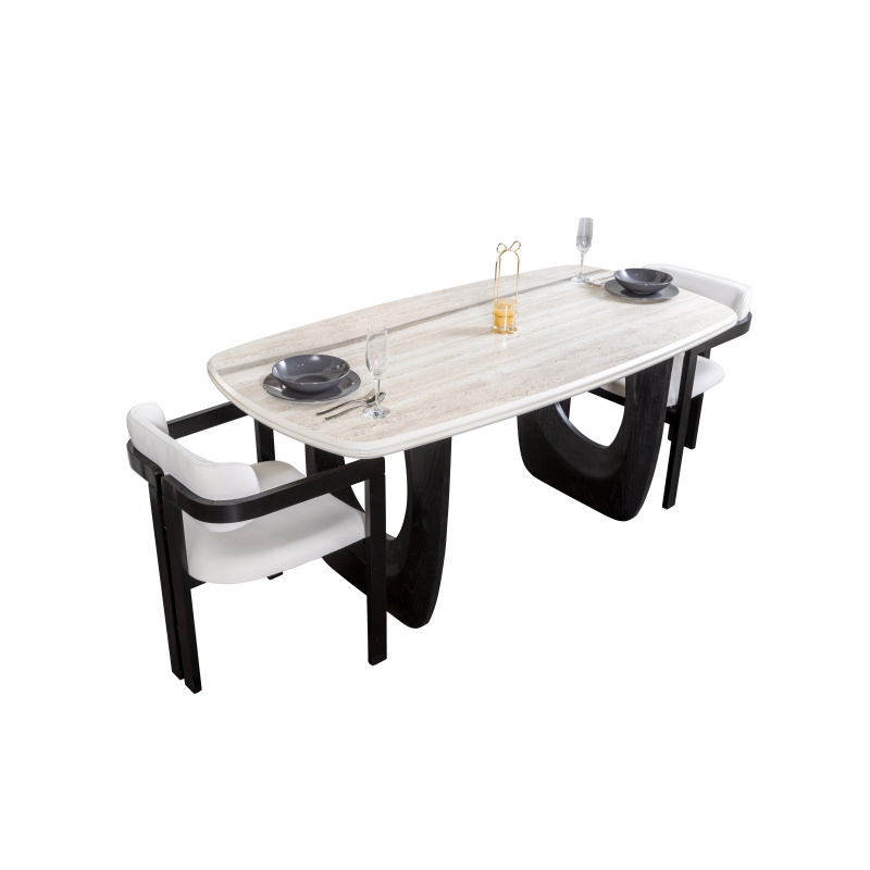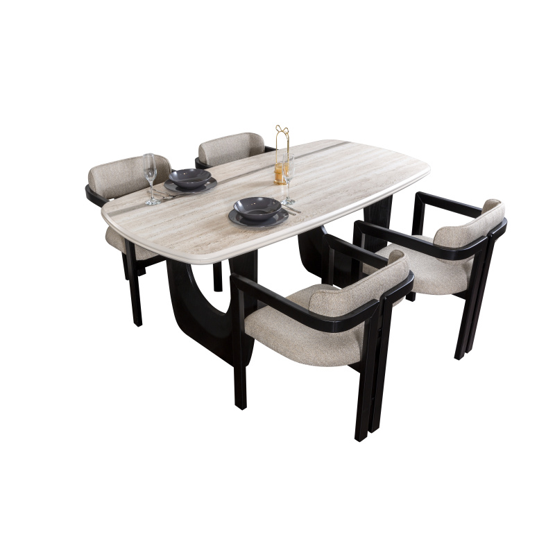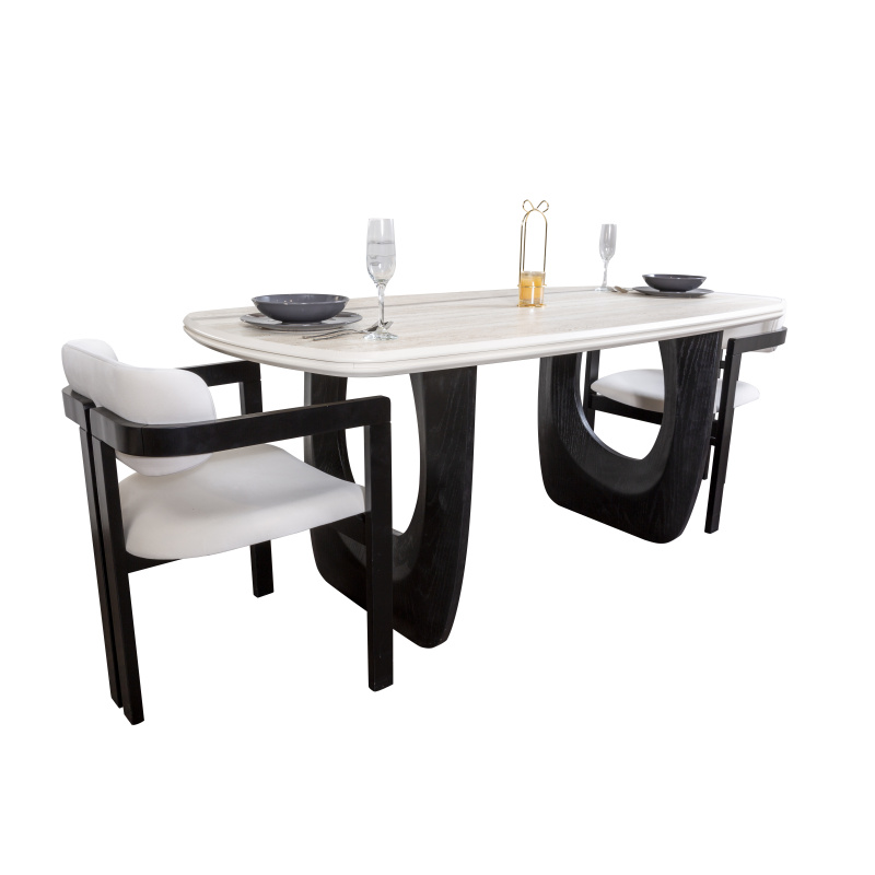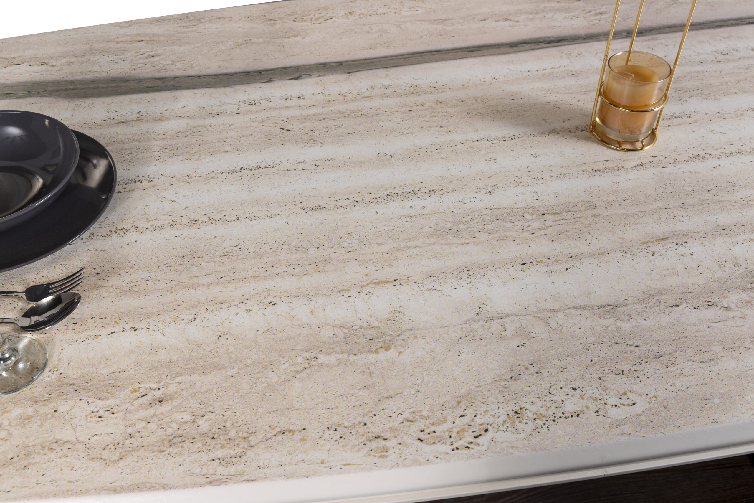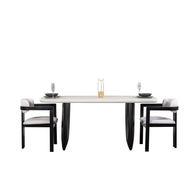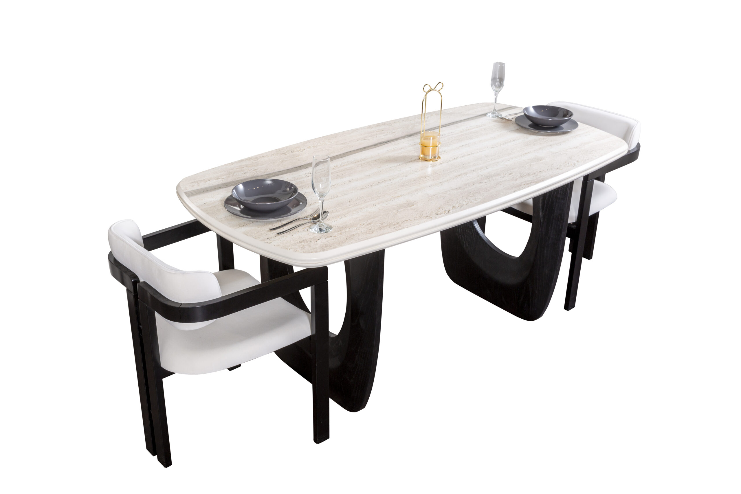 Dieser elegante Esstisch ist nicht nur ein funktionales Möbelstück, sondern auch ein wahres Design-Highlight für jedes moderne Zuhause. Die Tischplatte mit einer auffälligen, feinen Struktur und die markante Basis schaffen eine harmonische Balance zwischen klassischem und zeitgenössischem Stil. Die schwarzen Akzente an den Beinen sowie die bequemen, stilvollen Stühle aus hochwertigem Material runden das Set ab. Der Tisch ist in verschiedenen Farben erhältlich, wodurch er sich perfekt an dein individuelles Raumkonzept anpasst. Beachte, dass die Stühle nicht im Lieferumfang enthalten sind.